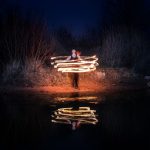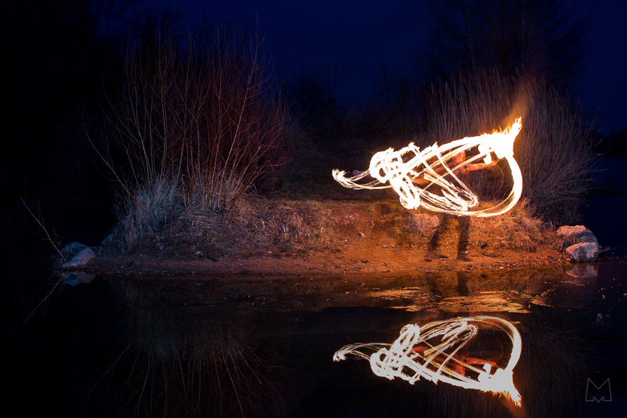 - Langzeitbelichtung für Feuerspuren, trotzdem scharfe Person ohne weitere Manipulationen.